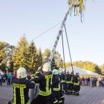 Vor der Preisverleihung aber muss der Maibaum aufgestellt werden. Die diesjährige Birke wurde direkt neben der Schule geschlagen, dort, wo hoffentlich bald die neue Turnhalle gebaut wird. Die Feuerwehrleute tragen den stattlichen Stamm von der nahen Feuerwehr auf den Platz und richten ihn unter dem Beifall der zahlreichen Besucher des Festes auf. Auf drei Meter Höhe ist eine Actioncam installiert. Ganz sicher wird man am kommenden Sonntag auf dem YouTube-Kanal Borkheide News TV von Lutz Behnke und Matthias Giese das Aufstellen aus Sicht des Maibaums nachvollziehen können. Ganz oben den Kranz hat die ortsansässige Gärtnerei Mahs mit Unterstützung des 97jährigen Kurt Wolf geflochten.