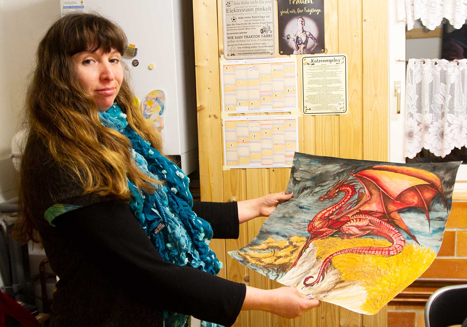Später nimmt sie die Fotos als Malvorlage. „Aber natürlich nehme ich mir künstlerische Freiheiten“, sagt sie und zeigt ein Foto und das zugehörige Bild. Außerdem macht sie gern Handarbeiten und arbeitet mit Speckstein und mit Holz:
