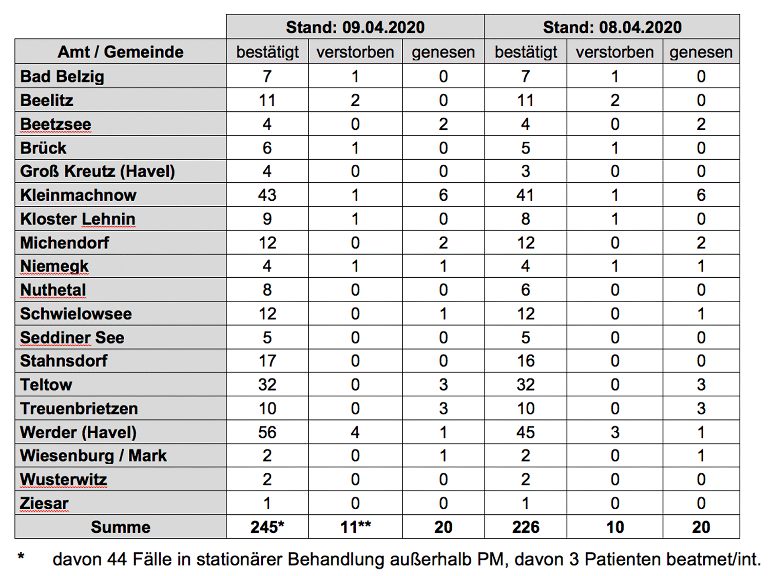 Potsdam-Mittelmark. Im Landkreis Potsdam-Mittelmark sind inzwischen 245 (+ 19 zum Vortag) Personen erkrankt. Weiterhin sind die meisten Fälle in Werder (Havel) sowie in Kleinmachnow, Teltow, Stahnsdorf, Michendorf Schwielowsee und Beelitz zu verzeichnen. 44 (+6) der infizierten Personen müssen bisher stationär (außerhalb von Potsdam-Mittelmark) betreut werden.