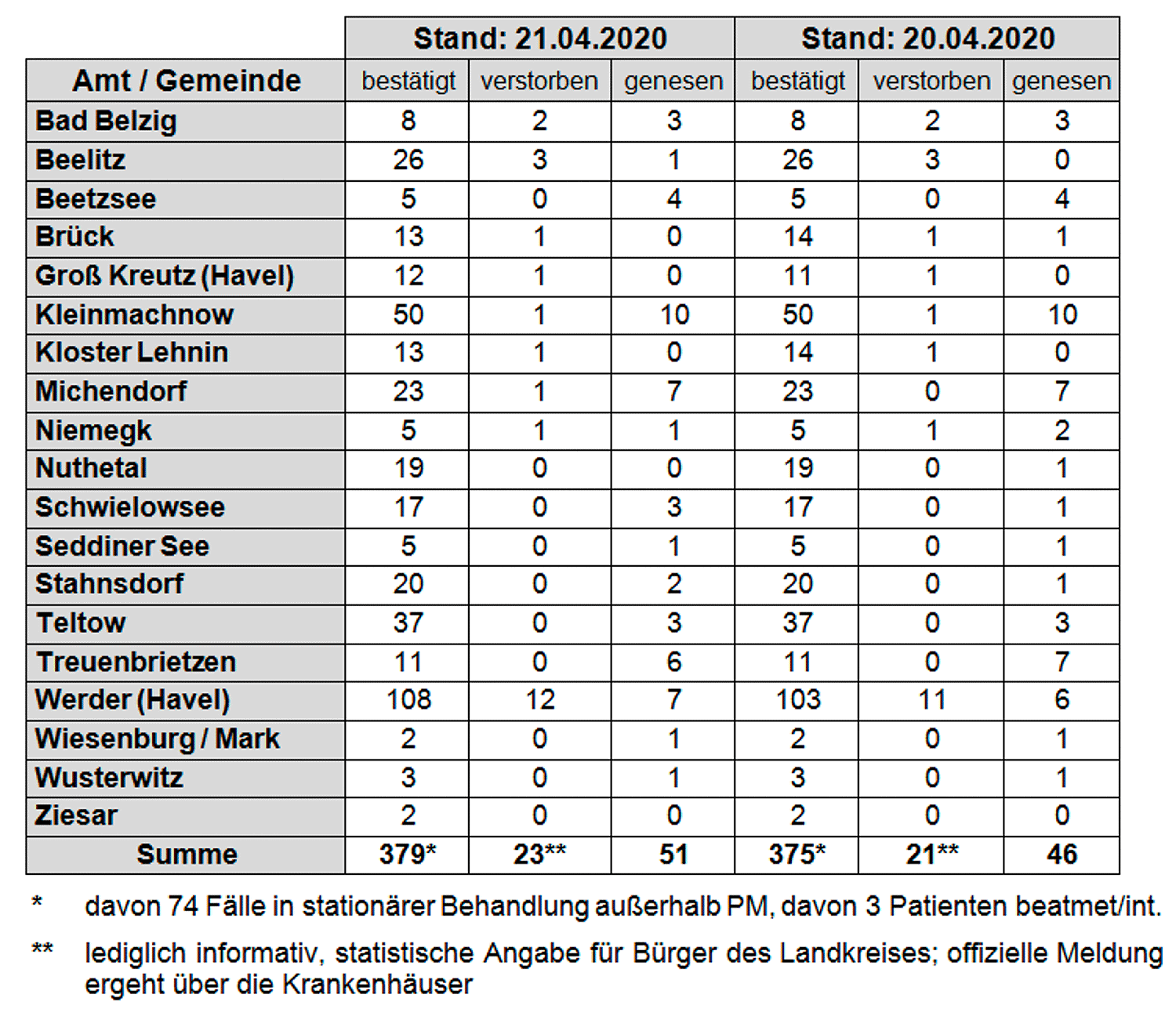 Potsdam-Mittelmark. Im Landkreis Potsdam-Mittelmark sind inzwischen 379 (+ 4 zum Vortag) Personen infiziert. Weiterhin sind die meisten Fälle (103) in Werder (Havel) sowie in Kleinmachnow, Teltow, Stahnsdorf, Michendorf, Schwielowsee, Nuthetal und Kloster Lehnin zu verzeichnen. Es werden aktuell 74 (+ 1) der infizierten Personen stationär (außerhalb von Potsdam-Mittelmark) betreut. Die Zahl der Verstorbenen im Landkreis hat sich gegenüber gestern um zwei Menschen auf insgesamt 23 erhöht.