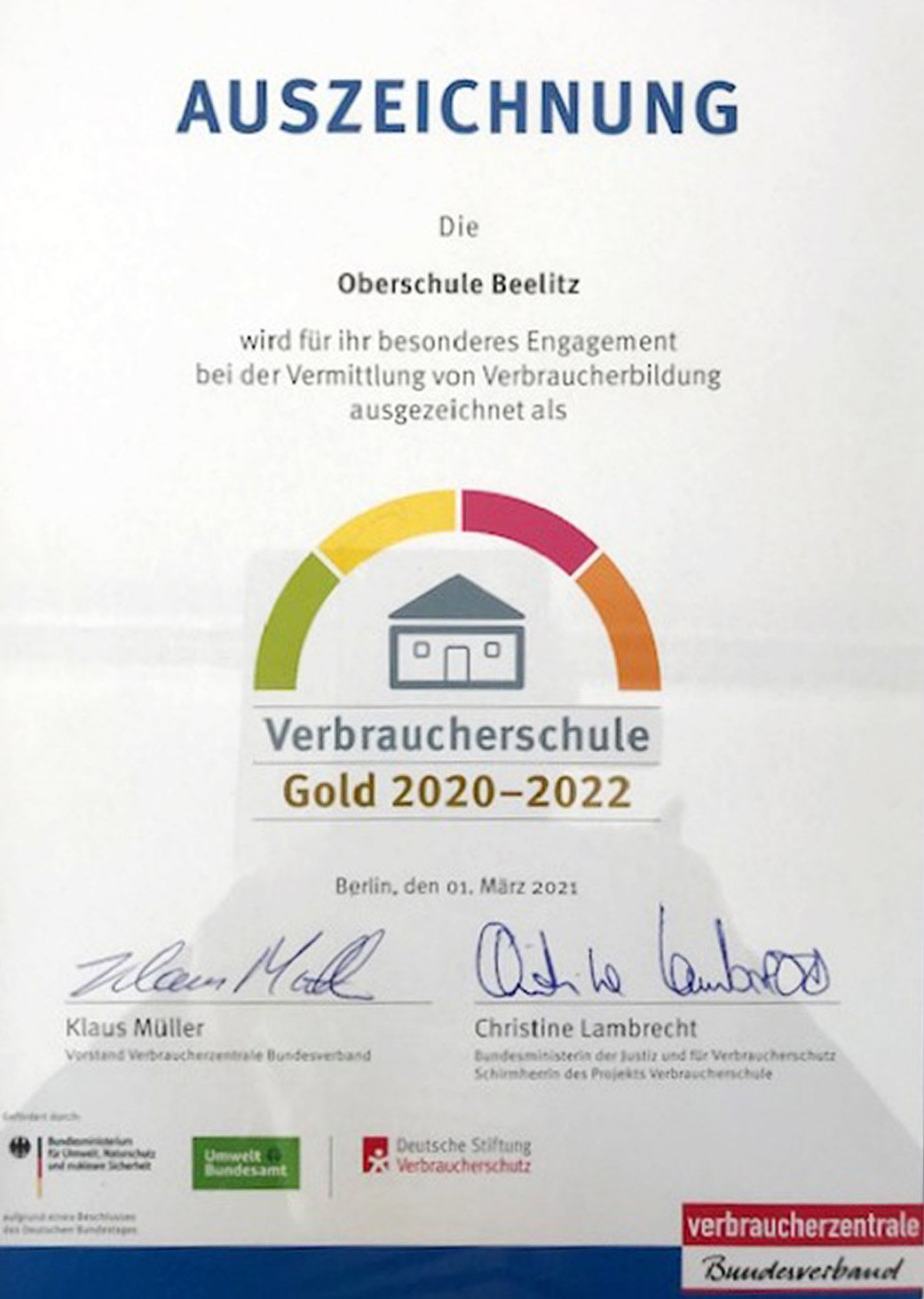 Beelitz. Große Ehre für die Oberschule: Der Bundesverband der Verbraucherzentralen in Deutschland hat das Engagement der Beelitzer Lehrer und Schüler für eine aktive Verbraucherbildung mit der Auszeichnung “Verbraucherschule” in Gold gewürdigt. Als Anerkennung lädt die Staatssekretärin für Verbraucherschutz, Anna Heyer-Stuffer, die ausgezeichneten Schulen am morgigen 9. März zu einem virtuellen Austausch ein.