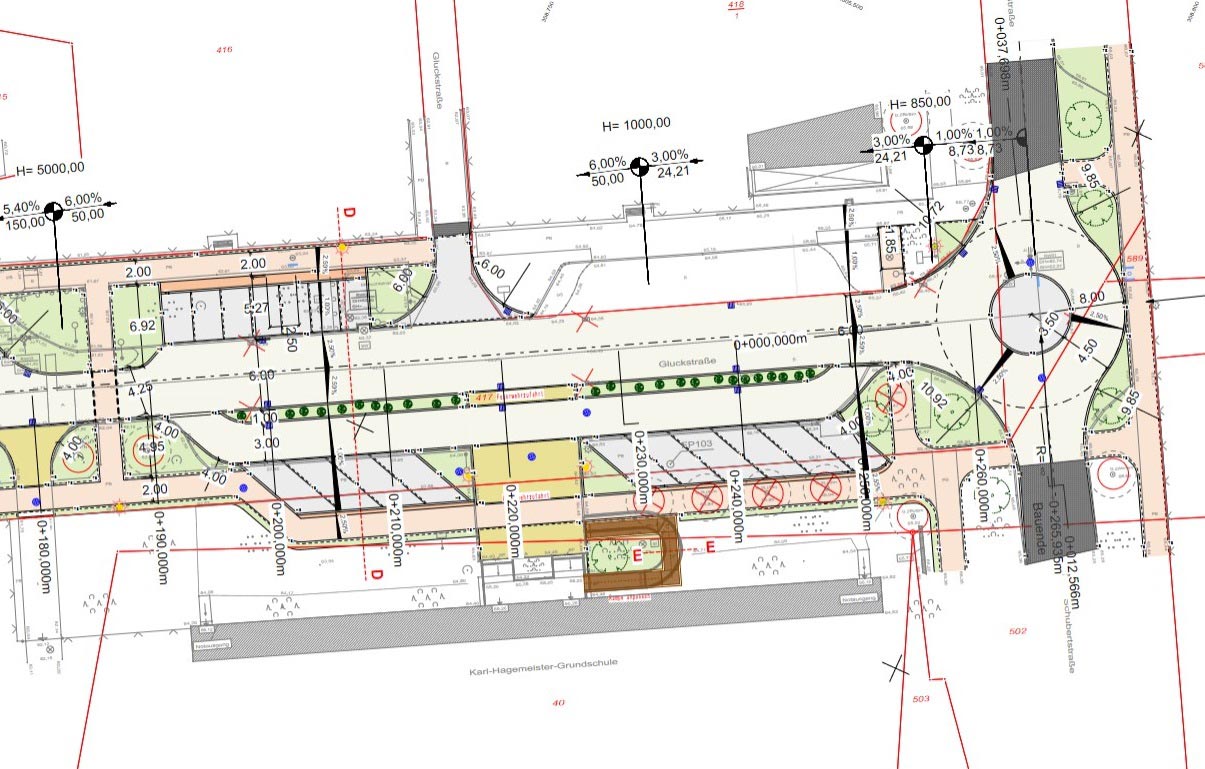 Die Gluckstraße wird, etwa an den jetzigen Standorten der Straßenbeleuchtung, mit neuen energiesparenden LED-Laternen ausgestattet. Die bestehenden Parkplätze werden erneuert. 7 Bäume und 50 Sträucher werden im Stadtgebiet als Ausgleich für die Baumaßnahme neu gepflanzt.